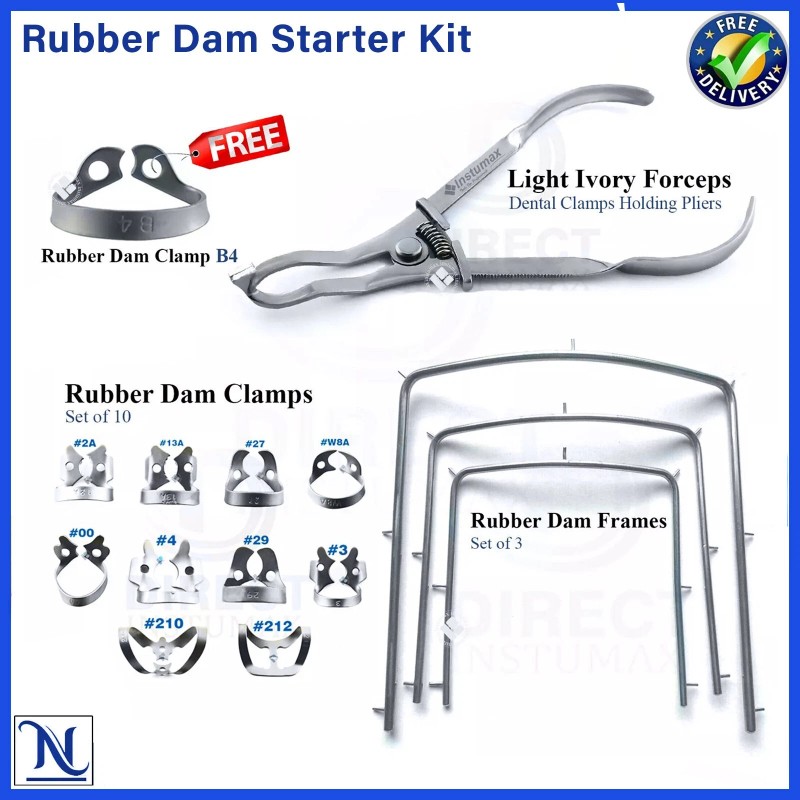 INSTUMAX Dental Instruments Rubber Dam Starter Set of 15 Tools with Frame Clamps Forceps