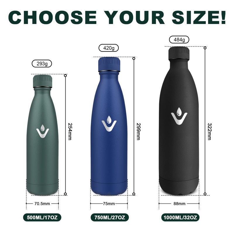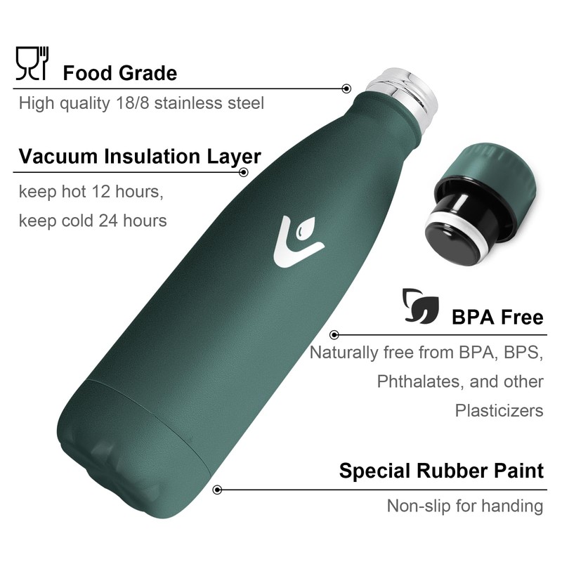 - VACUUM INSULATION Double wall insulation keeps drinks cold for up to 24 hours and hot for up to 12 hours, thermos bottles meet your temperature requirements at any time. The matte surface prevents condensation and provides a comfortable grip.