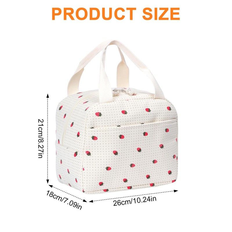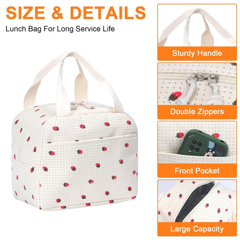 - 【PREMIUM MATERIALS】Crafted from high-quality corduroy canvas on the outside, this insulated lunch bag features an adorable strawberry pattern that adds charm to your day. It’s equipped with a sturdy handle and a smooth zipper for easy access. The interior is lined with eco-friendly aluminum foil to provide better insulation, keeping your food fresh.