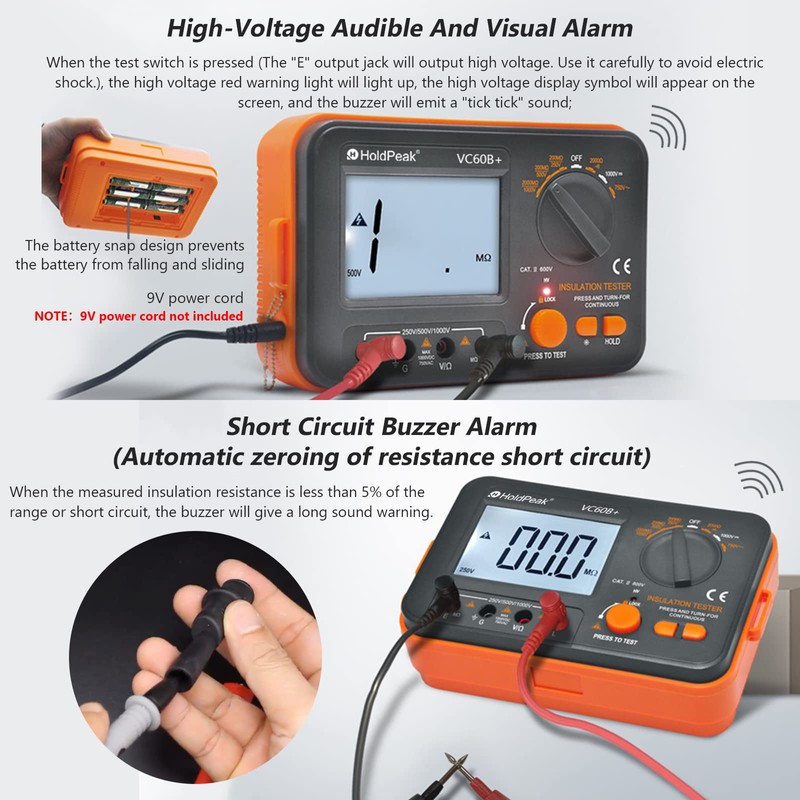 - Multifunctional tester: with over-range display, data retention, low battery display, backlight LCD, high voltage buzzer alarm, high voltage red light alarm and short circuit buzzer alarm. Suitable for measuring the insulation resistance of various types of electrical equipment and insulation materials such as transformers, cables, switches and electrical appliances.