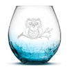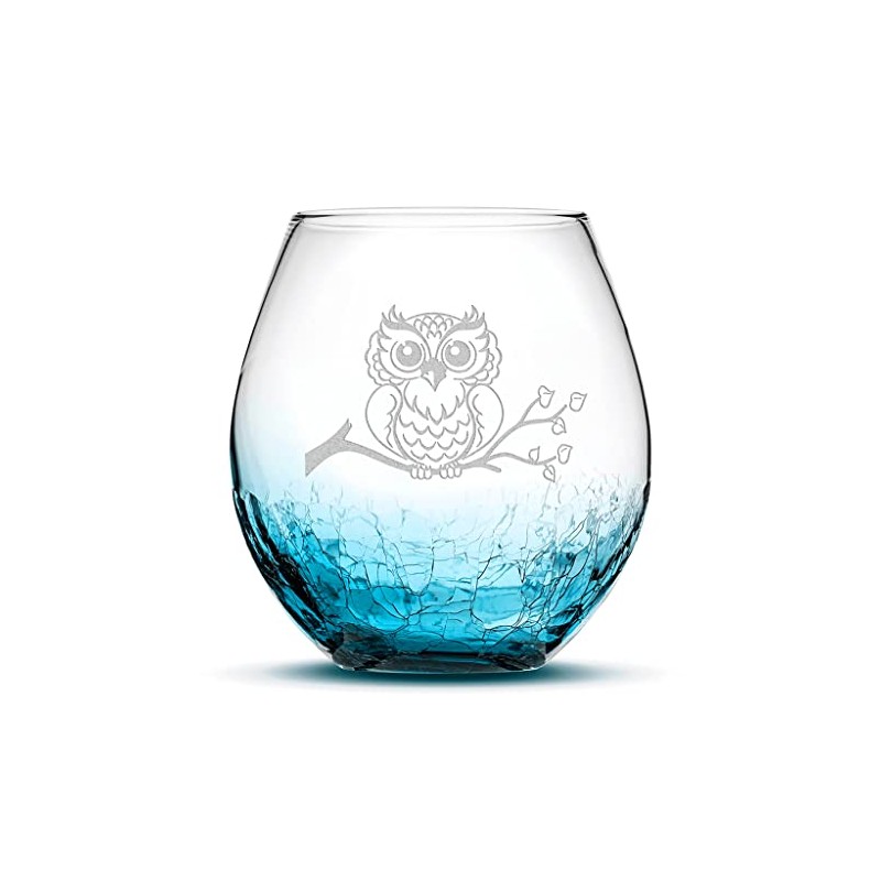 Integrity Bottles Resting Owl Design Stemless Wine Glass, Handmade, Handblown, Hand Etched Gifts, Sand Carved, 18oz (Crackle Turquoise)
