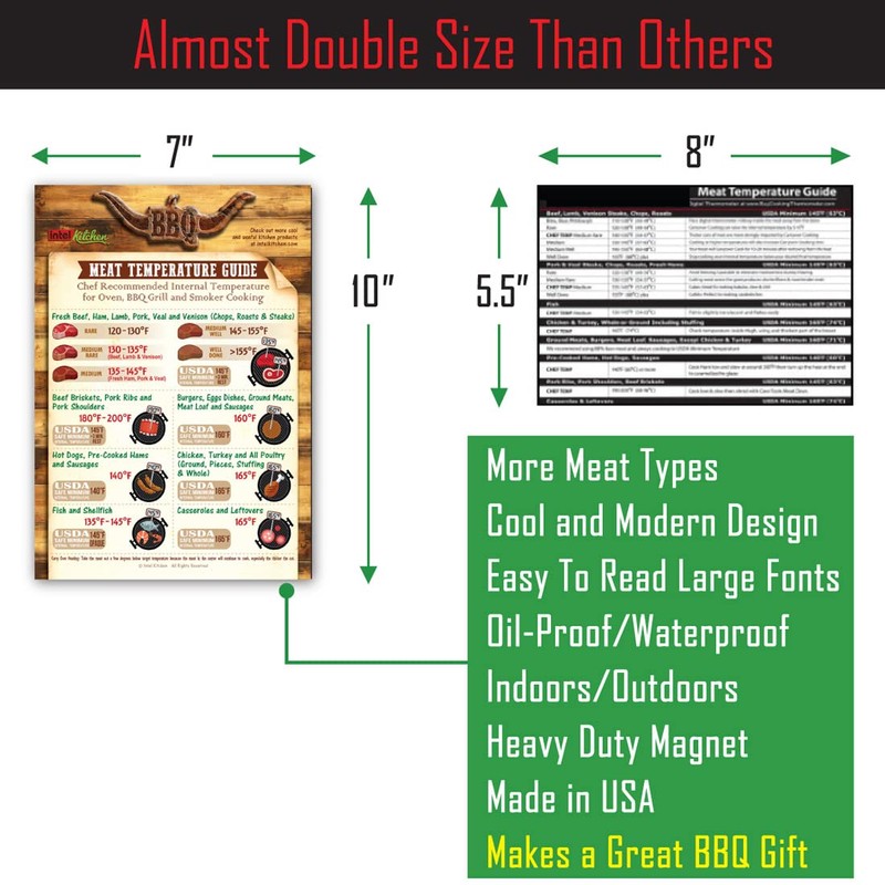 • Durable Meat Temperature Magnet -- This heavy-duty, laminated magnet is weather-proof and water-proof. No more searching or flipping pages. A hands-free reference guide that is handy to save time from checking your phone, computer or cookbook.