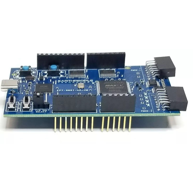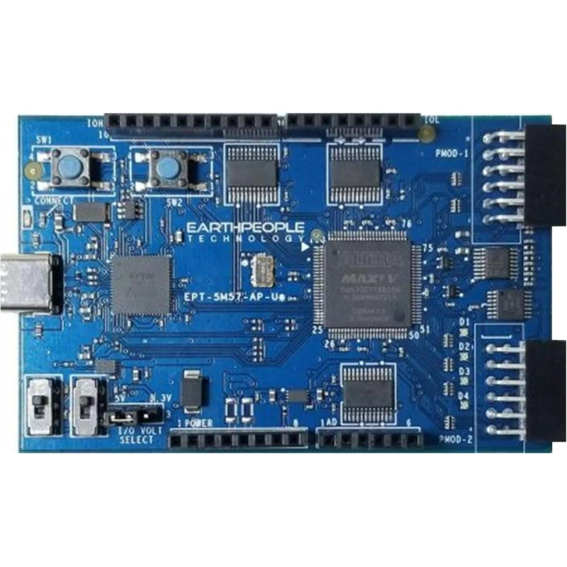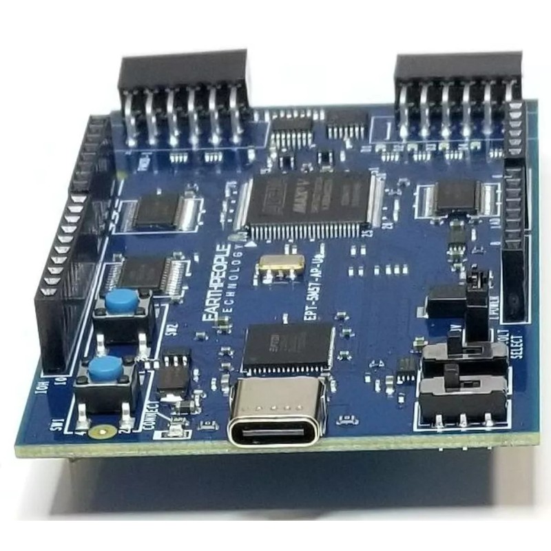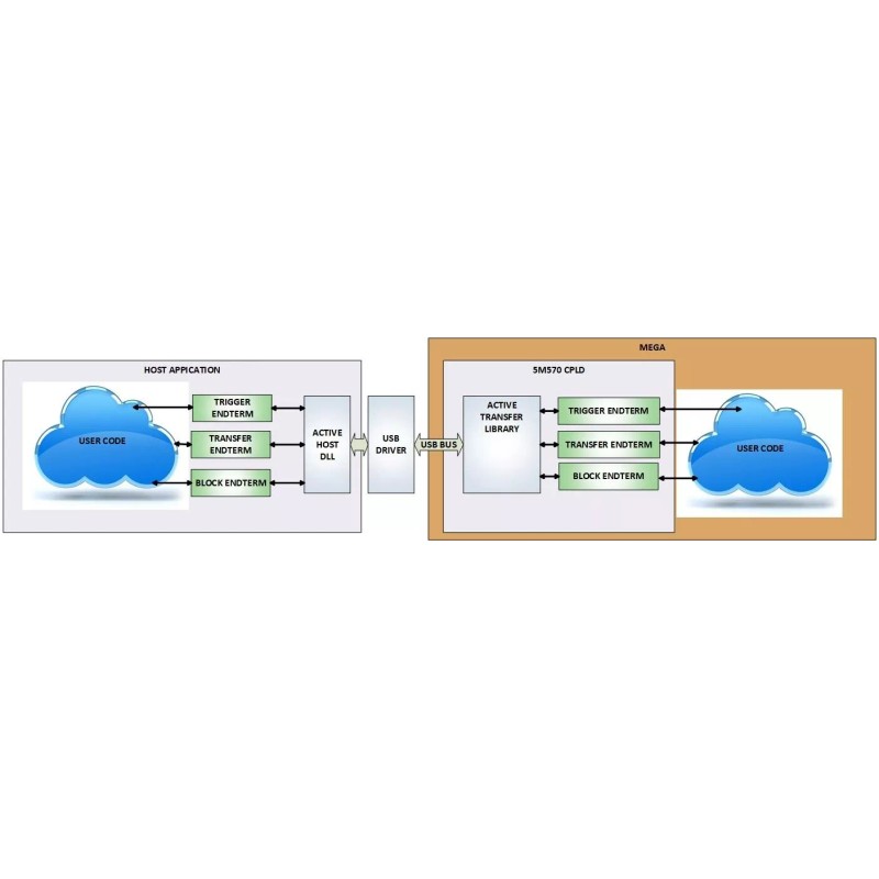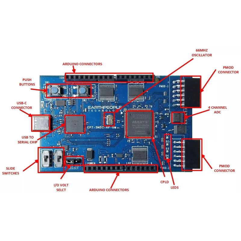 It also provides a high speed data transfer mechanism between an Arduino board and a host PC. The EPT USB-CPLD development system provides a convenient, user-friendly work flow by connecting seamlessly with Altera’s Quartus Prime software. The user will develop the code in the Quartus environment on a Windows Personal Computer. The programmable logic code is loaded into the CPLD using only the Quartus Programmer tool and a standard USB-C cable. The Active Host SDK provides a highly configurable communications interface between Arduino and host. It connects transparently with the Active Transfer Library in the CPLD code. This Active Host/Active Transfer combination eliminates the complexity of designing a USB communication system. No scheduling USB transfers, USB driver interface or inf file changes are needed. The EPT USB-CPLD development system is a unique combination of hardware and software. |