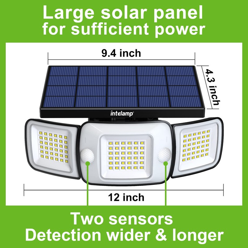 - [High-Efficiency Solar Panels & High-Capacity Batteries] intelamp solar security lights use high-power 40 square inch solar panels which charge more efficiently than the majority of products on the market. This allows the high-capacity battery to quickly hold 3 times more charge than other leading manufacturers. From a daylight fully charge the security lamps can last up to 3 nights in sensing mode at an impressive actual brightness of 1200 lumens.