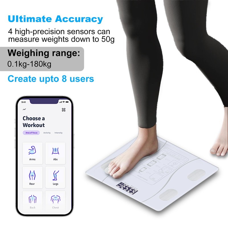 - Accurate and Intelligent Body Weight Scale: This advanced digital scale provides precise measurements of your weight, body fat percentage, BMI, and muscle mass, ensuring you have all the information needed to track your progress. Ideal for monitoring health and fitness goals, this scale for body weight features a high-precision sensor and a sleek design. With a weight capacity of up to 500lbs, it's perfect for various users. Its large LCD display and smart tracking make it a top choice among scales for body weight.