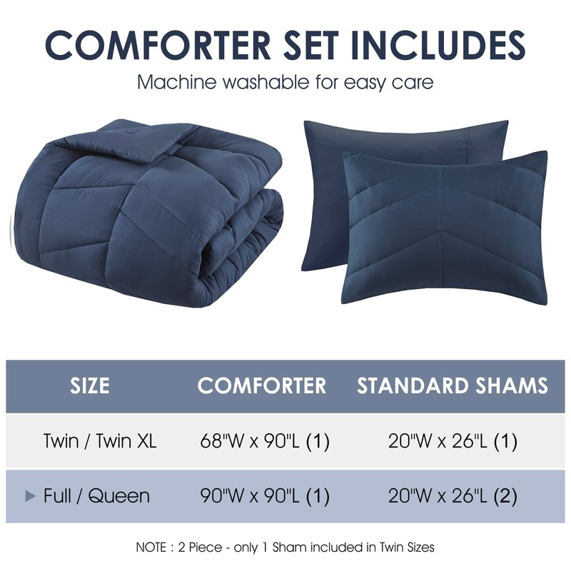 - Comforter set includes overfilled Queen size comforter set - 1 Comforter 90"W x 90"L, 2 Standard Shams 20"W x 26"L + 2"D(2)