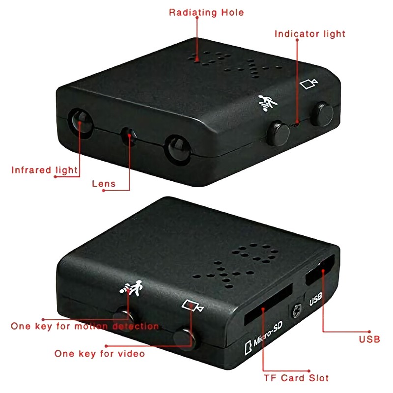 1、Just a 3x3x1,2 cm which makes it perfect as a security camera to home, camera for recording video without attracting attention. 2、The camera has a lens for HD video and the 2 parts of a near-infrared light is invisible 940nm. 3、Night vision distance up to 5 meters. It will either turn on or turn off automatically to night vision when the light is changing in the environment.