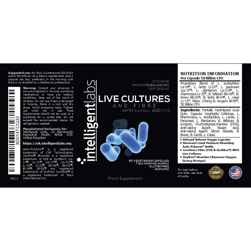 Intelligent Labs 50 Billion CFU Intelligent Labs Probiotics and Fibre, No Refrigeration Needed, with Sunfiber? & Fos, 2 Months Supply Per Bottle