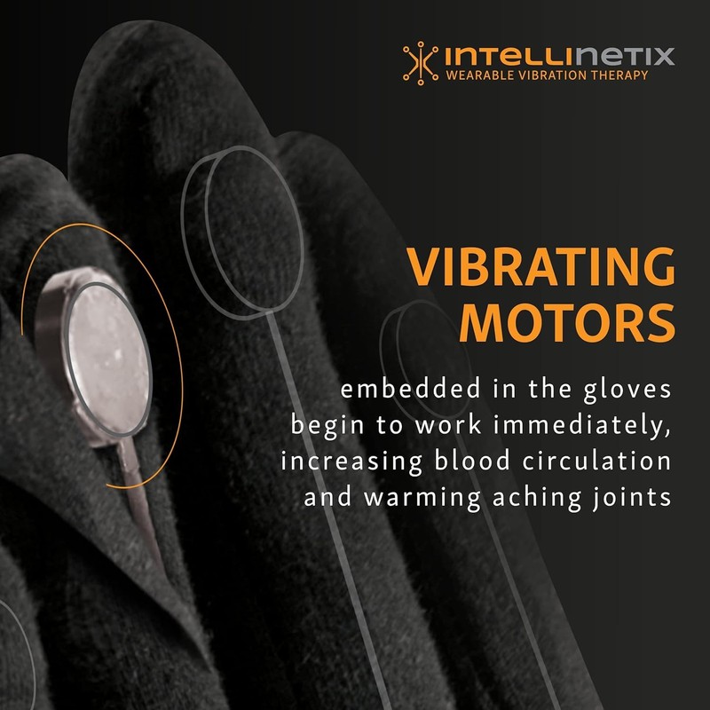 - VIBRATION. Intellinetix Therapy Gloves harness the proven power of vibration therapy to stimulate muscles and ligaments, increase circulation, and reduce pain and inflammation in aching joints. These patent-pending vibrating arthritis gloves are designed to provide soothing relief for those with arthritis or other chronic conditions that result in pain in the fingers or hands. Three distinct levels of vibration let you adjust the treatment to your comfort.