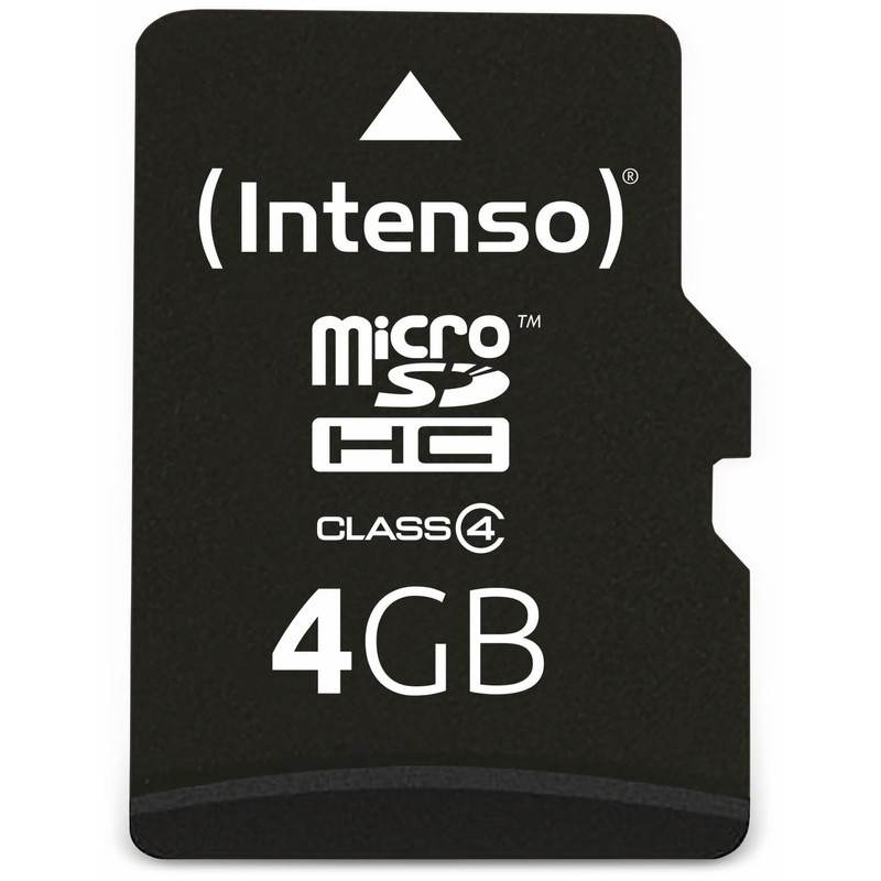 - Box contents: Intenso microSDHC 4 GB Class 4 memory card with SD adapter