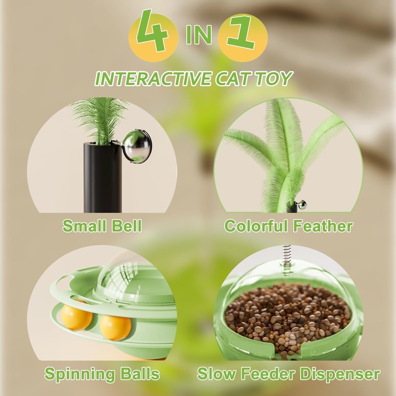 - 【4-in-1 Fun for Cats】An upgraded design of the interactive cat toy, with three ways to play: chase, pounce, and ambush. The spinning ball stimulates your cat's senses, the bouncing feather sticks inspire hunting instincts, and the spinning turntable encourages your cat to chase. All of these allow your cat to get enough exercise. There is also a food storage space, making your cat's feeding time fun and rewarding.