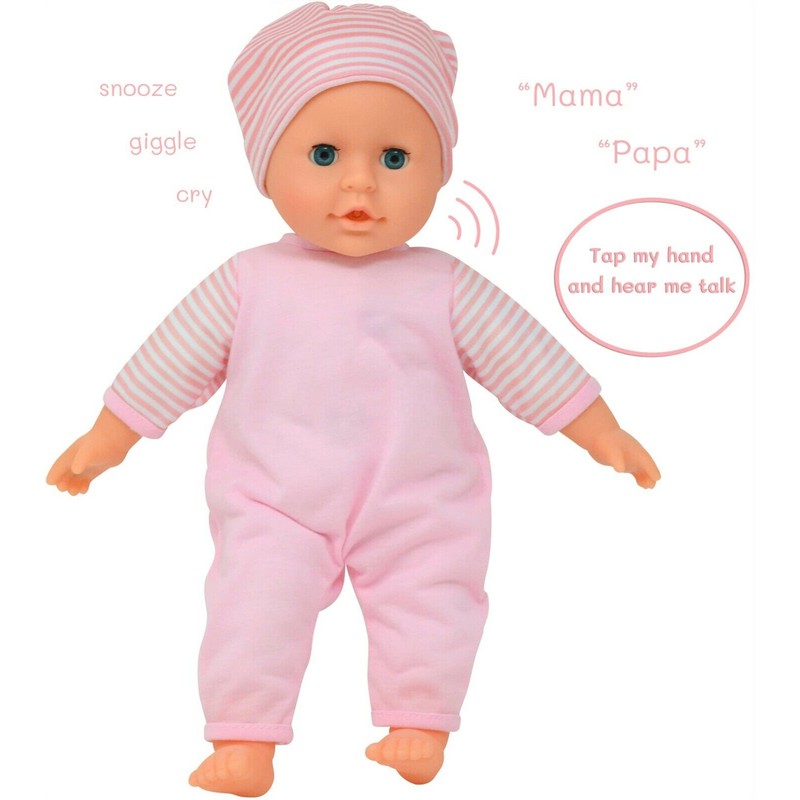 - TALKS, CRIES & MAKES SOUNDS: Equipped with a built-in touch-activated speaker triggered by gently pressing its hand, our battery-operated interactive baby doll giggles, cries, whimpers & babbles off cute baby talk. It’s the talking toy doll engineered to realistically simulate the audible sounds of a sick, sniffly, fussy baby crying for “mama”. Show your child how to care for, comfort & soothe the dolly to satisfy her simulated healthcare needs.