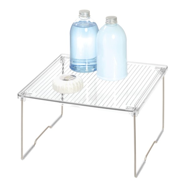 - STACKABLE - Create space-efficient bathroom storage in a snap with our iDesign Plastic Stackable Shelf Riser; This two-tier design allows you to rest items on top and underneath, creating two levels of storage space inside a cabinet, on a countertop, or under a sink; Risers stack securely creating a sophisticated storage solution in the bathroom or anywhere throughout the home; Use this shelf riser to hold storage bins, toiletries, cleaning supplies, and other essentials