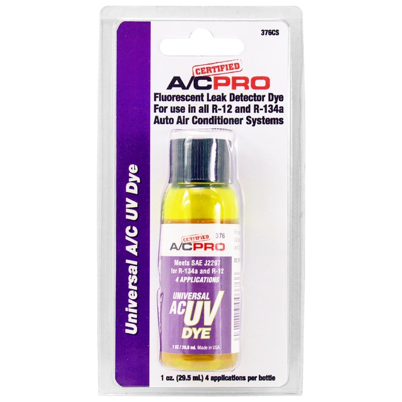 Certified A/C Pro Automotive Air Conditioning Universal A/C UV Dye is a UV leak detection dye to help detect leaks in automotive air conditioning systems. Can be used in all R-134A, R-12, and R-22 systems. Compatible with all PAG, ester, and mineral based refrigerant oils. Contains four one quarter ounce applications of universal air conditioning system UV leak detection dye. Meets SAE J2297.