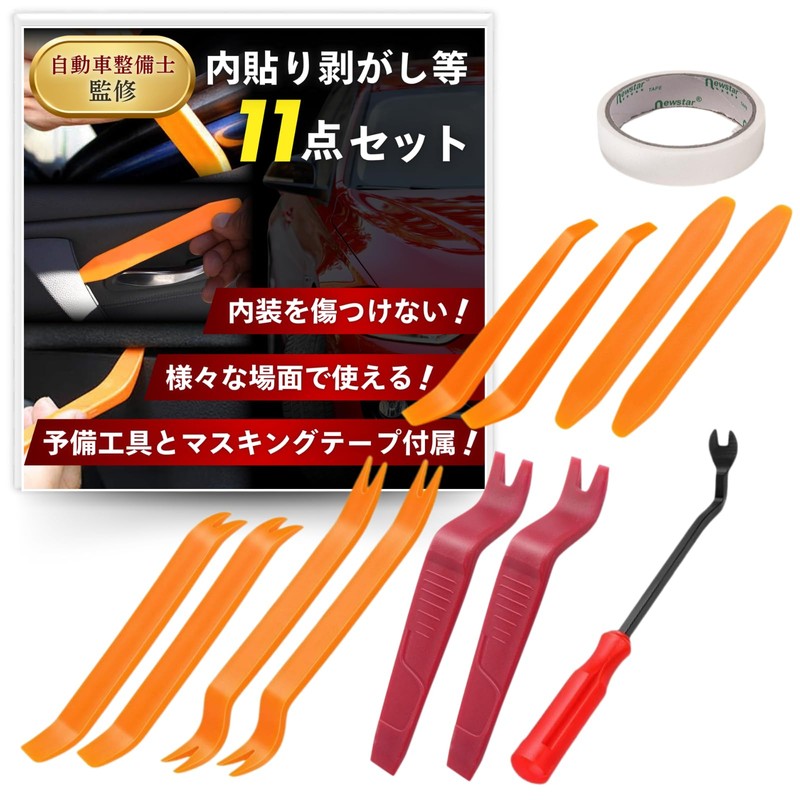 - Versatile: This 11-piece set can be used for all types of car tasks such as upholstery removal, panel removal, clip remover, and audio panels! Also comes with masking tape. Can be used for a wide range of applications, from beginners to professional mechanics