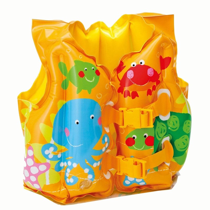 - This brightly colored swim vest covered with images of friendly sea buddies will welcome your new swimmer to the pool.
