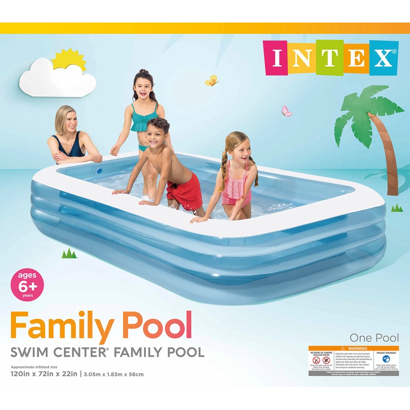 Intex swim center family pool. 120" x 72" x 22" large family pool. 3 air chambers each with double intake and free flow exhaust valve. 264 gallon capacity. 15 gauge vinyl. Extra wide side walls for comfort