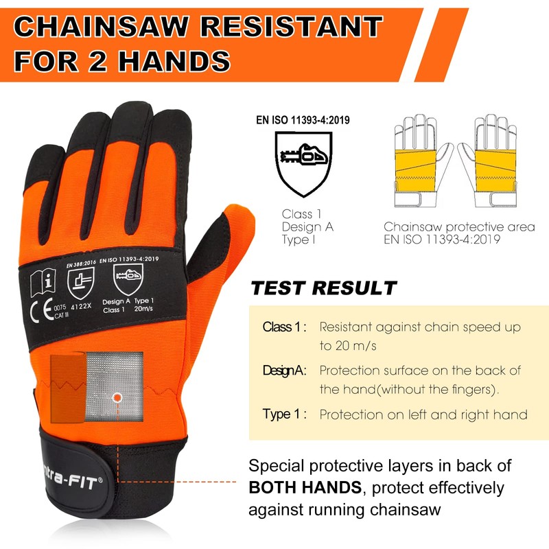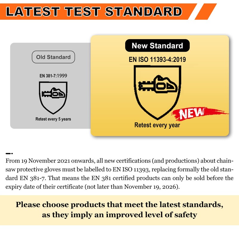 - Latest test standard: complies with the latest test standard EN ISO 11393-4:2019 and exceeds the outdated standard EN 381-7. Our chainsaw gloves are subject to strict annual inspection that ensures consistent and reliable quality. Test result: Design A, Type 1, Class 1 certification (20m/s).