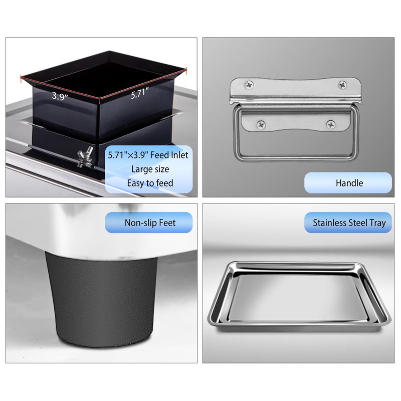 • Easy to Use & Clean: The top is equipped with a large 4.7" x 3.9" feeding port, which is easy to feed and makes it easier to cut meat multiple times; Adopting meat cutting and drive partition design, it can be directly rinsed with water from the feeding port without disassembly, making cleaning and maintenance of the meat cutting machine easy