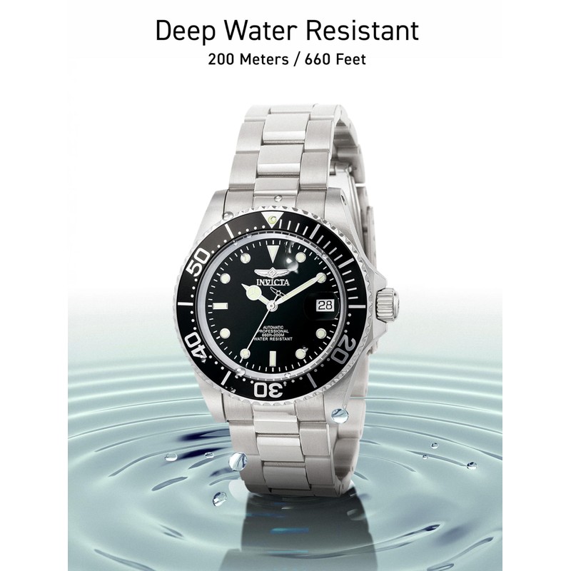 Classic styling and high performance add up to an outstanding sport watch for your land or sea adventures. This automatic watch, from Invicta's Pro Diver series, places a large round stainless steel case on a robust triple link steel bracelet. The black dial is designed for quick and easy read-off, even in low light conditions. It offers three-hand function with Tritnite-coated luminous hands and hour markers and a magnified date display at the three o'clock mark. The dial is capped with a resilient mineral crystal and framed by a black unidirectional rotating steel bezel with coin edge detailing. This watch is driven by Japanese automatic movement, which is visible through the see-through skeleton case back. It is rated water resistant to a full 660 feet (200 meters).