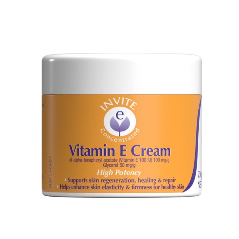Invite Concentrated Vitamin E Cream. High Potency. Each gram contains 100mg dl-Alpha Tocopheryl Acetate ( vitamin E ). Ideal for the treatment and management of minor burns, Dry cracked skin, scar tissue, skin rashes, irritations and abrasions, sunburn, nappy rash, stretch marks and helps protect against premature ageing.
