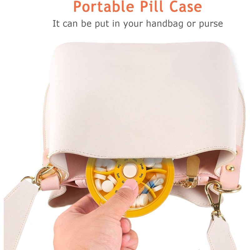Simplify Your Daily Medication Routine with INVODA's Rotating Pill OrganizerKeep your essential vitamins, fish oil supplements, and daily medications perfectly organized with our innovative 7-day rotating pill case. Unlike traditional pill boxes, our unique rotating design makes medication management effortless and convenient.Key Features & Benefits:Smart Rotating MechanismSimple button-activated rotation systemSmoothly rotates to align each day's compartmentOne-handed operation perfect for seniors and travelersClear viewing window to easily check medicationComplete Travel-Ready SetIncludes 4 colorful organizers (green, pink, blue, orange)Comes with 4 premium felt storage bagsProtective cases prevent damage during travelCompact size fits perfectly in purses or pocketsPremium Quality MaterialsMade from durable, BPA-free PP plasticShatter-resistant constructionTransparent dust-proof coverPermanently printed day labels won't fadeEasy to UsePress the center button to rotate compartmentsAlign desired day with dispensing slotOpen side lid to access medicationsRefill weekly for continuous organizationPerfect For:Seniors managing multiple medicationsFrequent travelers needing portable organizationBusy professionals with daily supplementsParents organizing children's vitaminsAnyone who wants simplified medication managementProduct Specifications:Dimensions: 3.54" diameter  1" heightWeight: 144g (lightweight design)Materials: Food-grade PP plastic + feltIncludes: 4 pill organizers + 4 storage bagsWhy Choose INVODA?We're committed to creating innovative, high-quality organization solutions that make daily life easier. Our rotating pill organizer combines smart design with premium materials to provide the perfect medication management system for your needs.