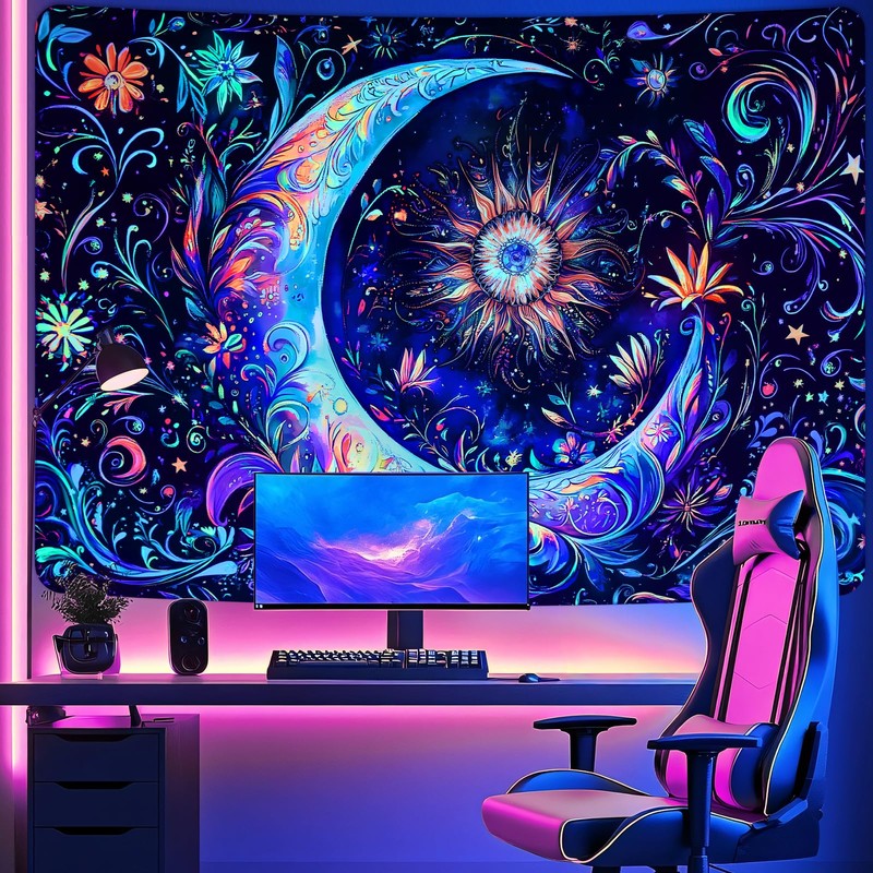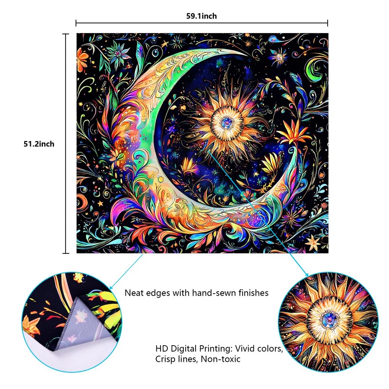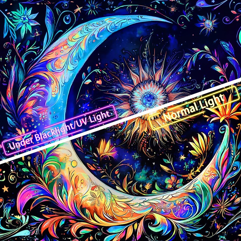 - IMMERSIVE DESIGN: Immerse yourself in a vibrant, mystical world with this mesmerizing UV reactive tapestry featuring a cosmic moon and sun mandala design with vivid colors and intricate patterns, creating a captivating visual experience.