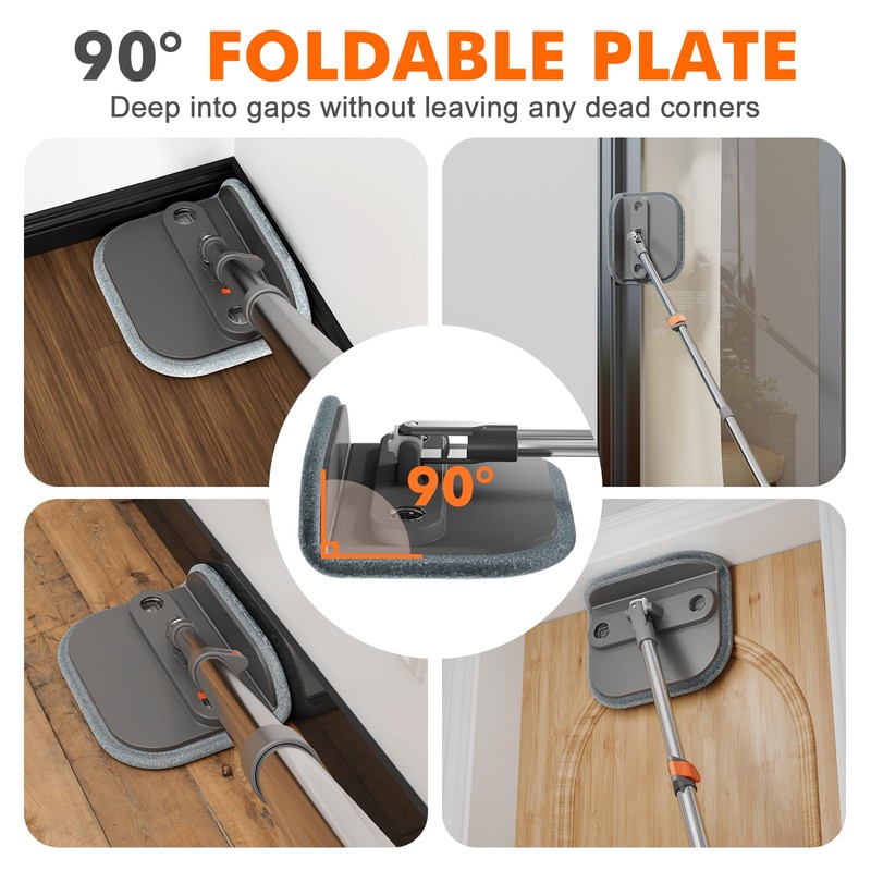 - Upgraded Foldable Mop Plate: One side of the mop plate folds up at a 90-degree angle, while the square mop head rotates 360 degrees. This design allows for easy cleaning under furniture, in corners, along baseboards, and around window and door frames. Each self-standing mop and bucket set includes 2 machine washable microfiber mop head replacements, perfect for hardwood floors, tiles, and marble.