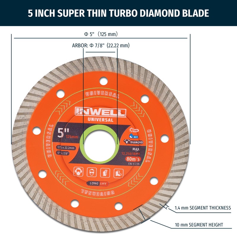 INWELL 5 Inch Super Thin Diamond Saw Blade, Turbo Wave Rim, Hot-Pressed Tile Cutter Disc for Porcelain, Marble, Granite, Concrete, and Brick – 7/8” Arbor (2-Pack)