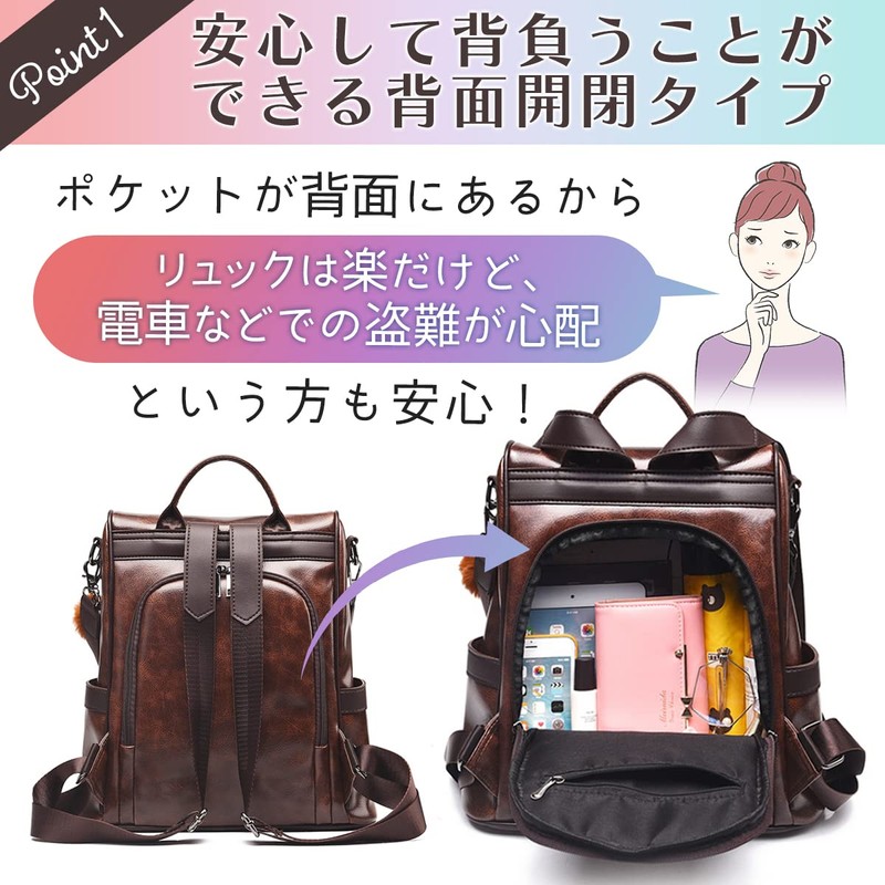 - This leather-like backpack is designed to be opened from the back to prevent security, security, and theft