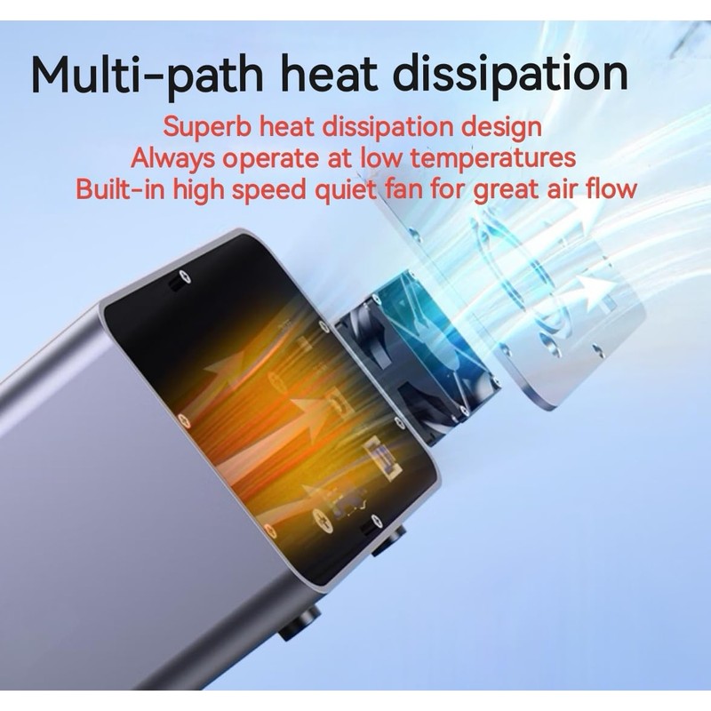 • Built with rugged heat-dissipating aluminum shell, smart fan control can effectively accelerate air convection. The fan adjusts its speed automatically based on the hard drive's temperature, providing optimal cooling with low noise.