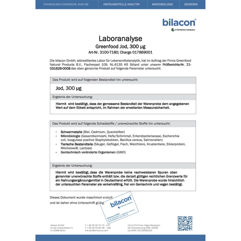 For the formation of thyroid hormones and for normal thyroid function, the body needs iodine - in sufficient quantity! Up to 70 percent of the absorbed amount of iodine is already needed for the thyroid gland! Thyroid hormones promote energy metabolism, bone formation and brain development. They regulate the metabolic processes in almost every body cell. Iodine is essential for a well-functioning nervous system. Not only for the nerves in the body, but also for the nerve cells in the brain. Iodine promotes important higher brain functions such as memory, concentration and logical thinking. Germany is considered an iodine-deficient area. In the event of an iodine deficiency, an enlargement of the thyroid can occur, which can be visible on the outside of the neck as a "choker". If you do not regularly eat larger quantities of sea fish, a dietary supplement with iodine is extremely advisable. Sufficient iodine supply is necessary, especially during pregnancy and breastfeeding, to avoid serious development disorders of the unborn and infants. Greenfood Iodine is ideal for ensuring the supply of iodine to the body and preventing deficiencies.