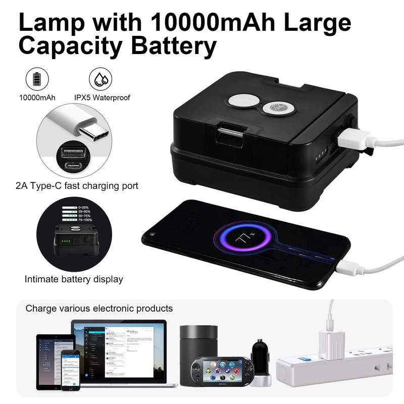 - 🌞【High Lumen and Long Battery Life】 6000LM outdoor camping lantern can help you keep a clear view in any dark environment. 10000mAh led rechargeable lantern can illuminate continuously for 12 hours in the high light mode and over 24 hours in the low light mode.