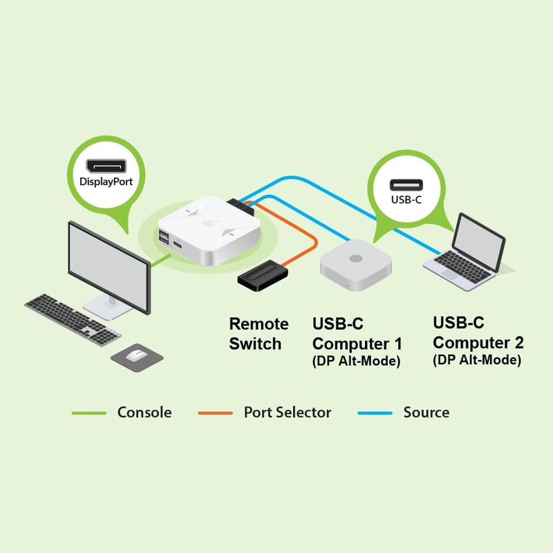 - A 2-port 4k USB-C KVM switch with DisplayPort output is the perfect method to connect and switch from two computers equipped with a USB-C output port and a DisplayPort KVM monitor