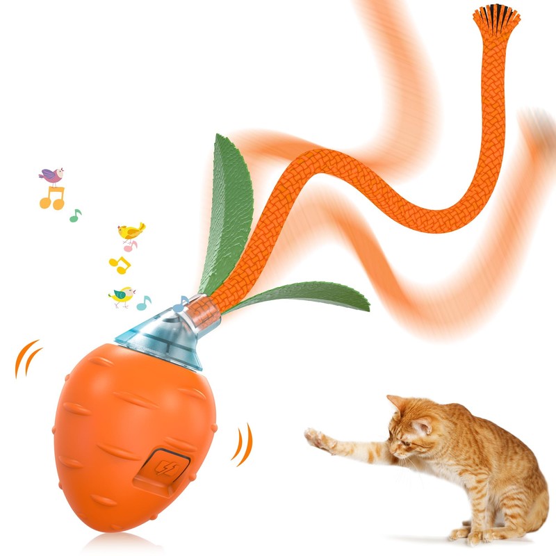 - 【Dancing Carrot Ball】Cute carrot electric cat toy that comes with a sturdy nylon rope. When the cat toy is turned on, the nylon rope flings itself after the cat ball, and no cat or kitten can resist the attraction of the ball and rope! The irregular movement trajectory allows cats to chase and pounce, unleashing their natural hunting instincts.