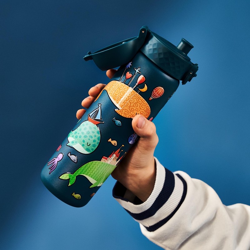 Ion8 Steel Water Bottle, 600 ml/20 oz, Leak Proof, Easy to Open, Secure Lock, Dishwasher Safe, Flip Cover, Fits Cup Holders, Carry Handle, Durable, Metal Water Bottle, Raised Print, Whales Design