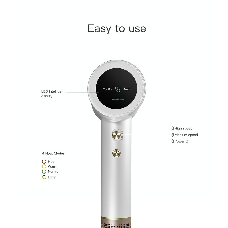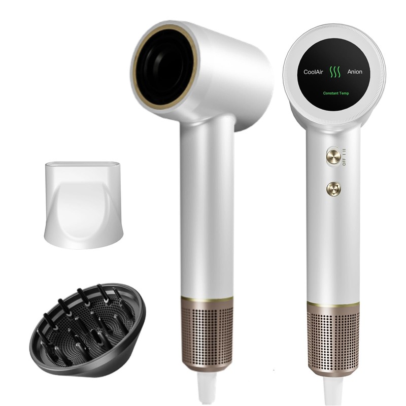 This hair dryer is a light luxury style, pearly white body, gold color scheme in the light and shadow. With the crystal screen, showing excellent texture. It has fine workmanship, excellent quality and reliable performance.