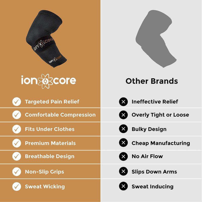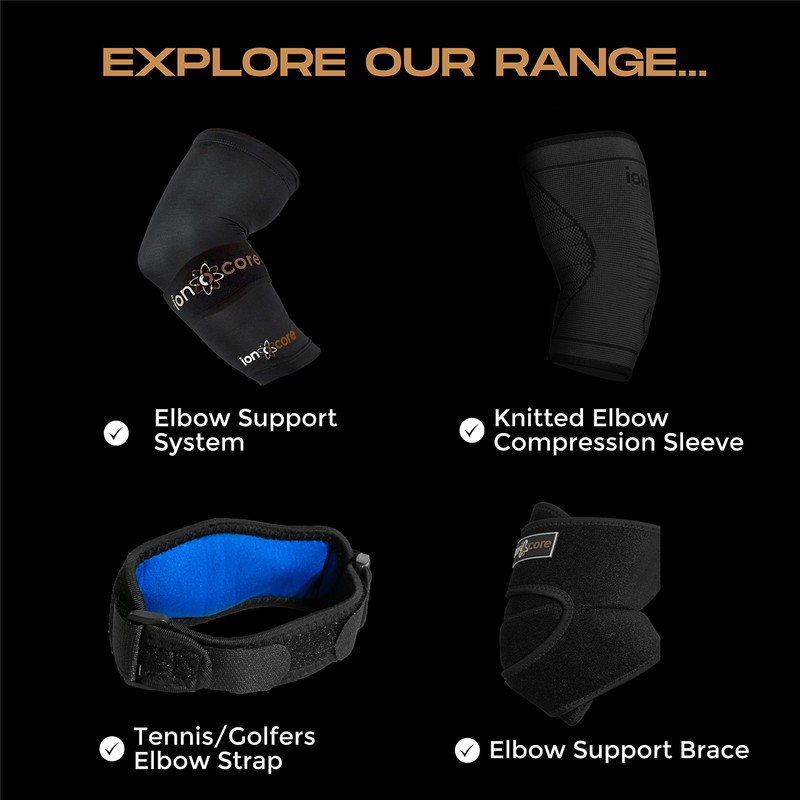 - THE ALL ENCOMPASSING ELBOW SUPPORT SYSTEM: ionocore's elbow support system is engineered to give you comprehensive elbow and joint support. The compression fit works to support and assist recovery without restricting movement, mobility or blood flow. Our golfers elbow support system includes a 88% copper compression elbow support sleeve and a padded tennis elbow brace strap to ensure your entire elbow & forearm joint is supported and on route to recovery.