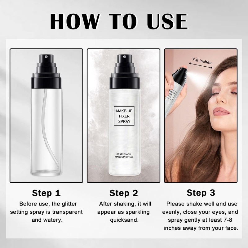 - HOW TO USE: Before use, the glitter setting spray is in a transparent watery state. After shaking, it will appear as sparkling quicksand. Please shake it well and use it evenly. Close your eyes and gently spray at least 7-8 inches from your face to make your skin evenly radiant