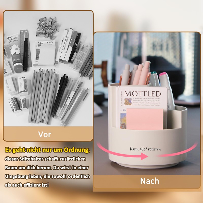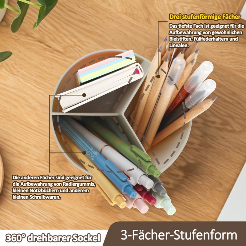 - Innovative design in stair shape The rotating pen holder impresses with its unique staircase design with 3 compartments. This structure allows for clear and orderly storage of pens, rulers, erasers and other stationery. Perfect for anyone who values style and function.