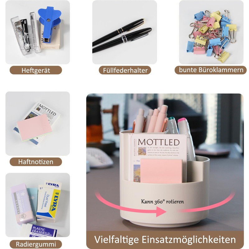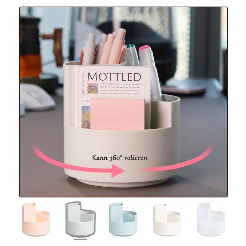 - 360° rotating base for easy access Thanks to the 360° rotating base, you can easily reach your stationery without having to move the quiver. Ideal for use on desks at home, in the office or in the classroom.