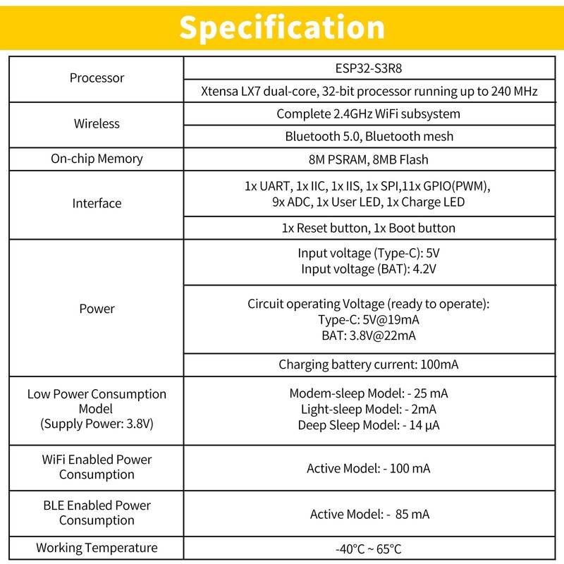 - XIAO ESP32S3 supports lithium battery charging management and allows for deep sleep mode with power consumption as low as 14μA. With 4 adjustable power modes, XIAO ESP32S3 can balance communication distance, data rate, and power consumption to meet the needs of various application scenarios