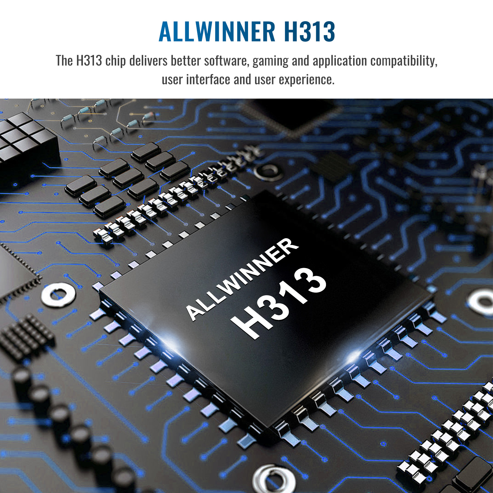 Der TV BOX HThe TV BOX H313 is equipped with a Quad Core ARM Cortex A53 CPU.This powerful CPU provides ultra-fast running speed and professional image processing functions, ensuring a stable and smooth operation when loading movies and playing games without any delay. |