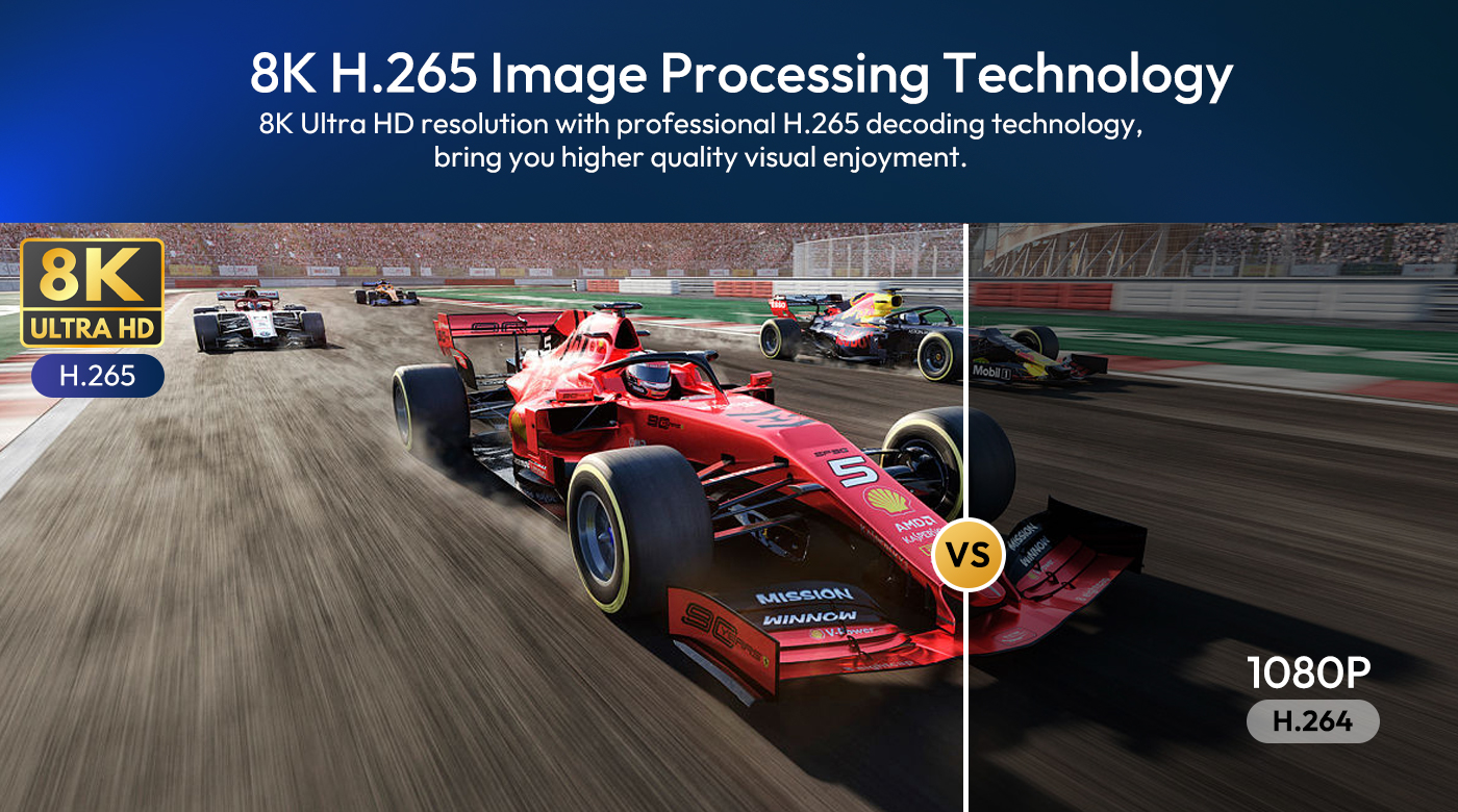 •The device receives signals via H.265 video decoding, thereby outputting remarkably realistic 6K image quality and promptly restoring every minute detail of the image. It not only endows you with a more seamless HD video experience but also economizes 50% of broadband resources, ensuring an optimal combination of visual excellence and efficient data utilization. |