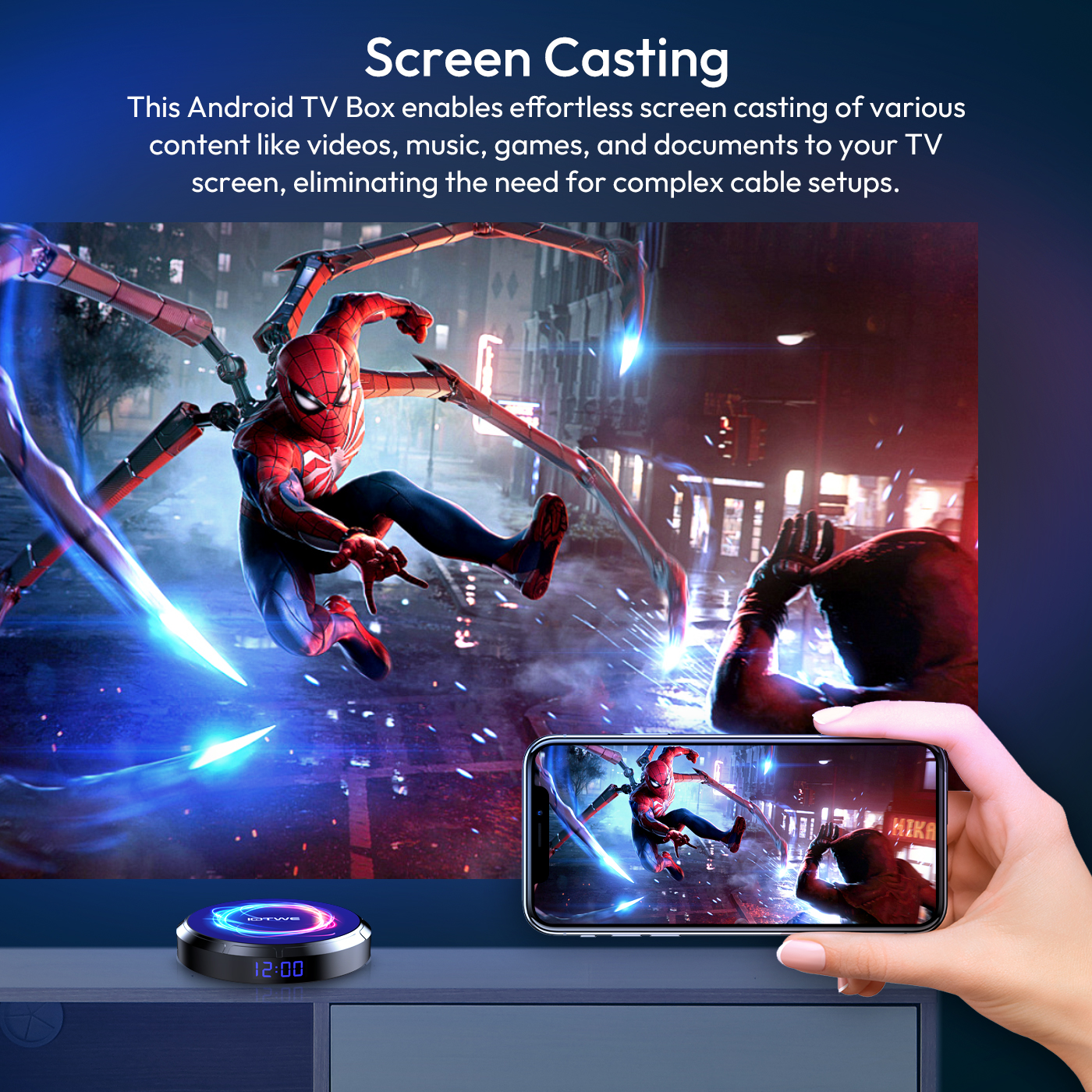 • With this Android TV box, you can easily stream a variety of content, including videos, music, games and documents, to your TV screen without complicated cable installation. The connection allows you to realize screen interactions on multiple devices, taking your user experience to a higher level. |