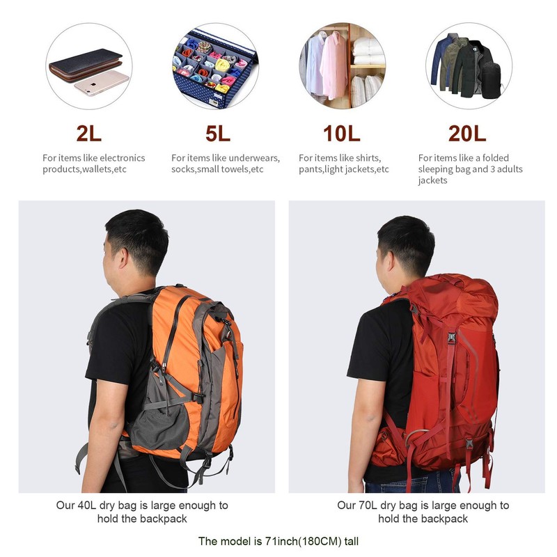 - A variety of colors and 6 sizes: The dry sack is with bright and eye-catching colors, 2L/5L/10L/20L/40L/70L multi-size capacity to choose, you can store all your travel necessities