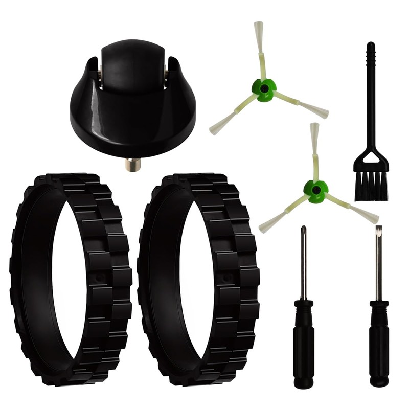 - 【What you Get】2 x Side Brushes, 2 x Tires, 1 x Front Wheel Caster, 1 x Phillips #1 Screwdriver, 1 x Flathead Screwdriver, 1 x Cleaning brush.