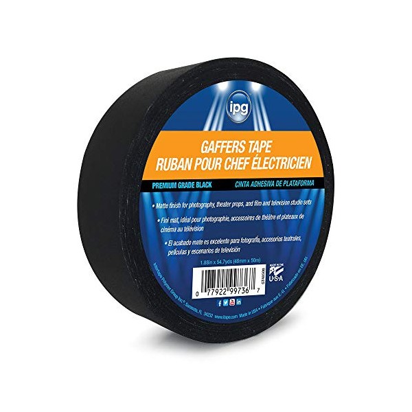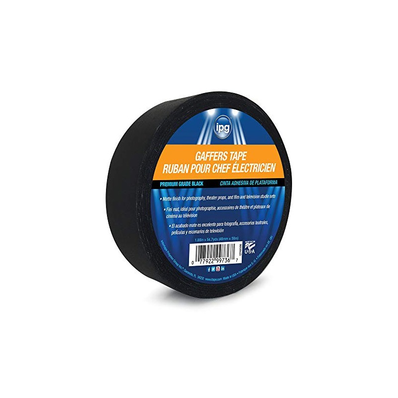 IPG Gaffers tape is a vinyl (PVC) coated cloth tape with an aggressive pressure sensitive natural rubber adhesive. Designed to adhere securely to a variety of surfaces. Low-gloss (matte / lusterless) finish minimizes the reflection of lighting on live stage and studio sets. Works well for bundling and wrapping wires, holding wires and cords to prevent trip hazards, masking stage floors, black-out masking on scenery panels or backstage areas and much more.