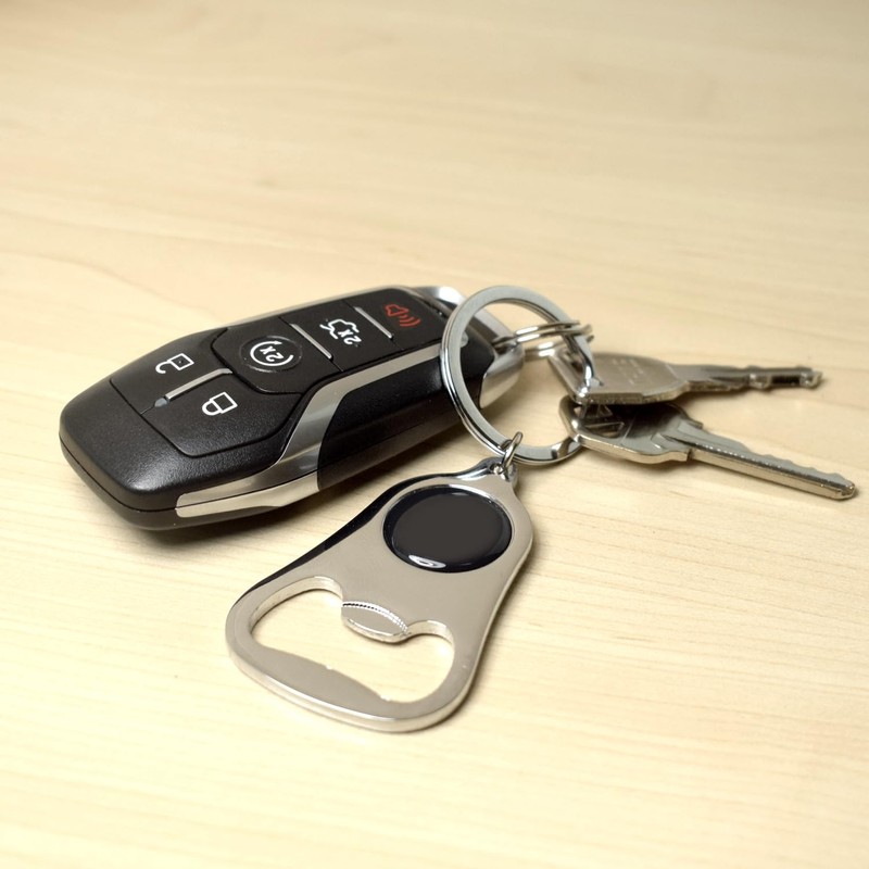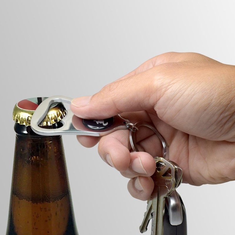 - This sleek keychain doubles as a functional bottle opener. It is perfect for everyday use and casual moments.
