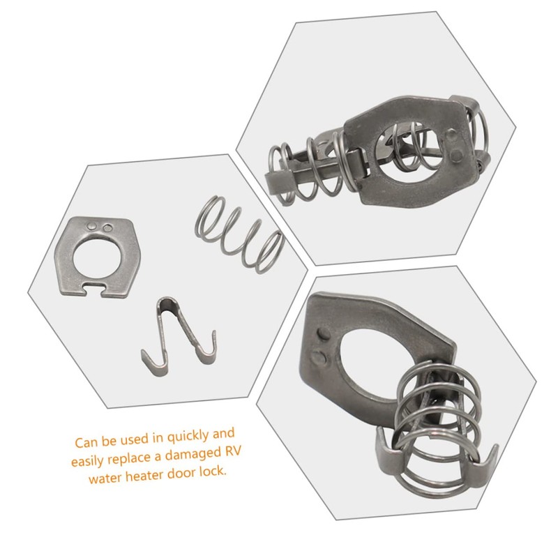 - Rv water heater latch: easy to install: first compress the spring, move the flat part to one side and remove it, then pass the v-shaped part with the spring through the hole in the cover from the back, and push the spring. with fine workmanship, simple in design and very practical in use, easily win your favors.